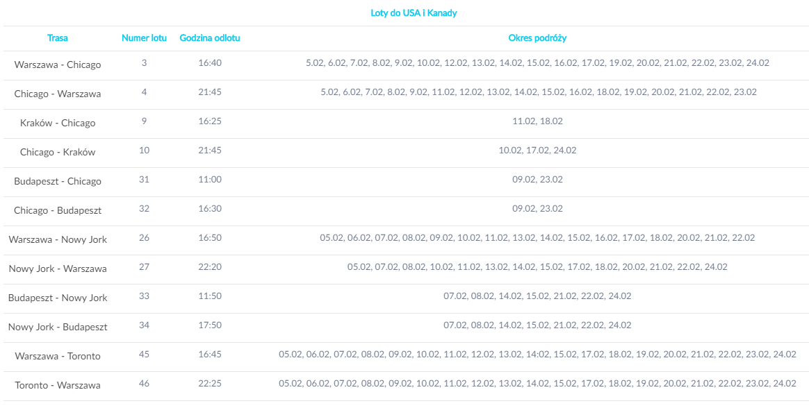 Pełna lista połączeń promocji milowej LOT-u najMILszy poniedziałek: